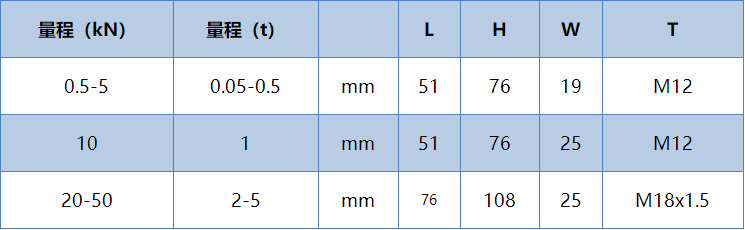 量程:500N(50kg)、1kN(100kg)、2kN(200kg)、3kN(300kg)、5kN(500kg)、10 kN(1t)、2 0kN(2t)、30 kN(3t)、50 kN(5t)